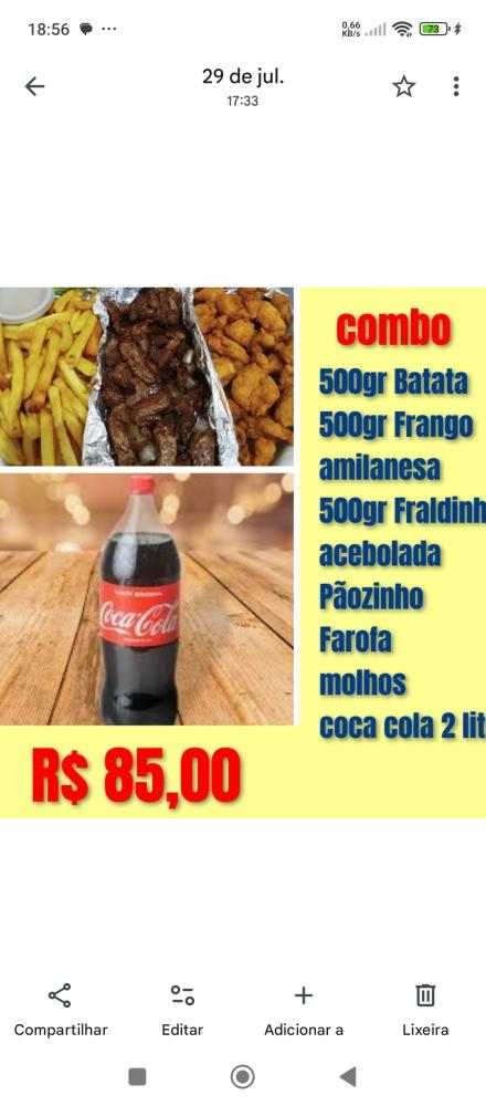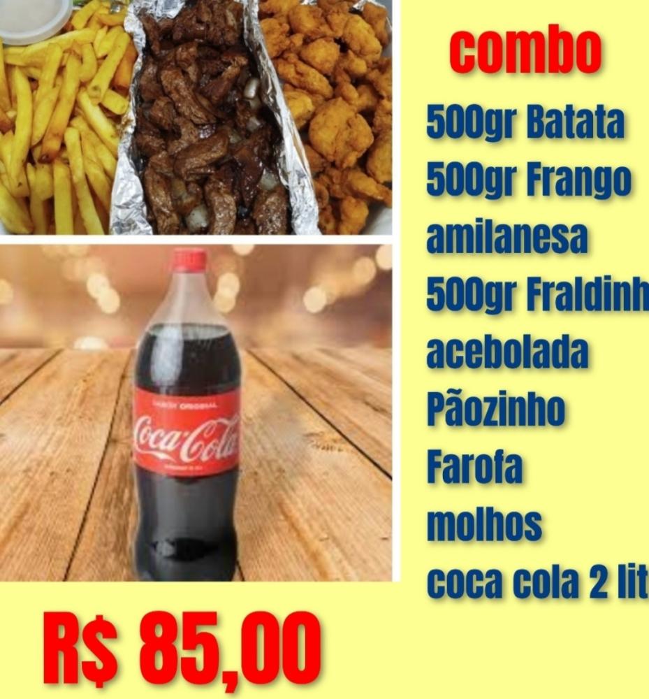 Combo G de Fraldinha acebolada,Frango amilanesa Batata coca cola 2 litros